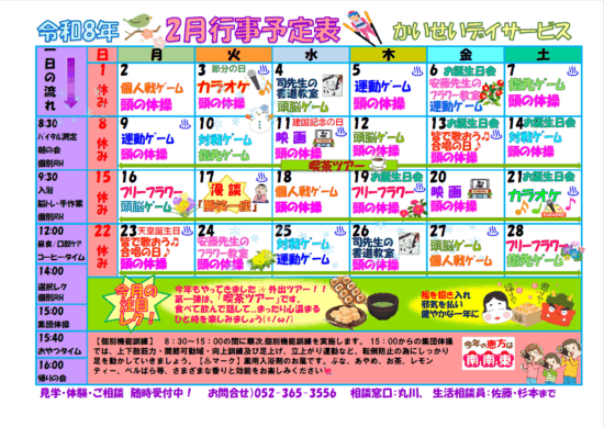 2026年1月6日 / 最終更新日時 : 2026年1月6日 wpsystem 行事予定表 1月の行事予定表を掲載しました かいせいデイサービス2026年1月の行事予定表を掲載しました。 PDF版はこちらからダウンロード下さい。