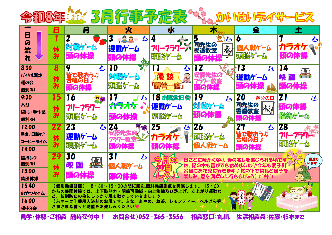 かいせいデイサービス2026年3月の行事予定表を掲載しました。
